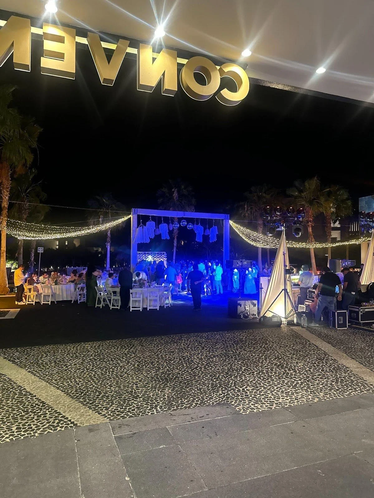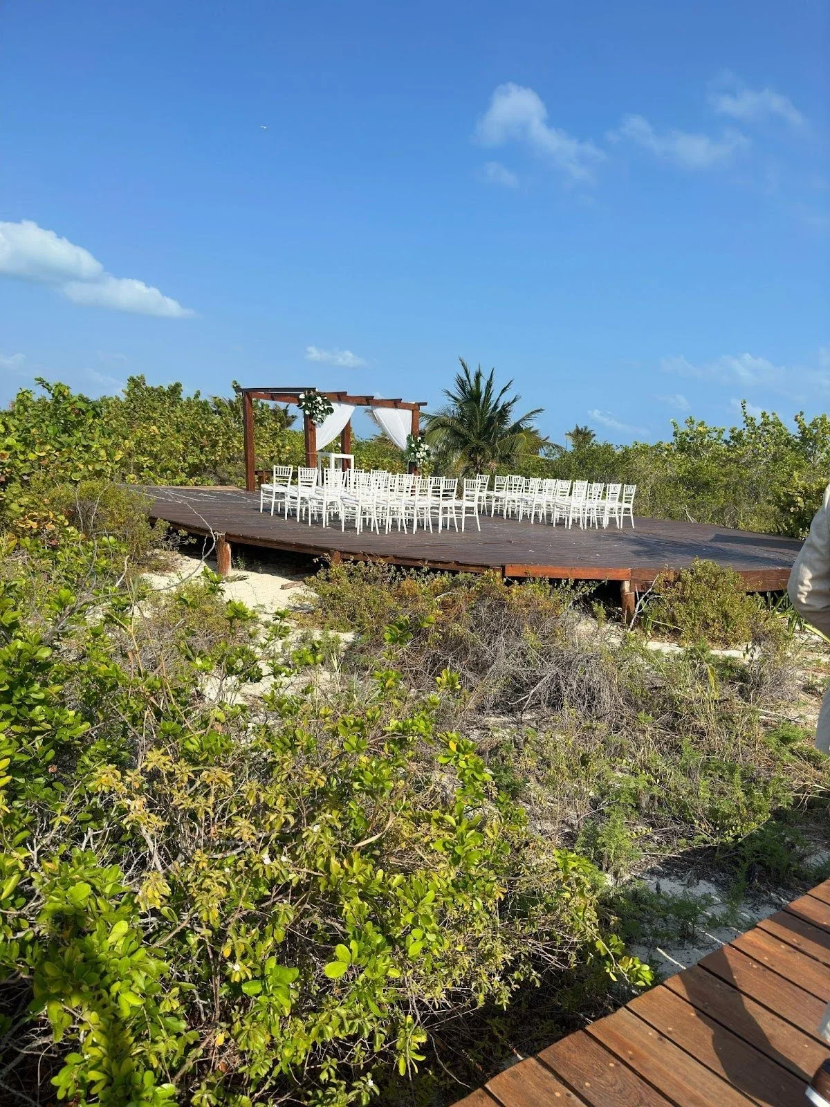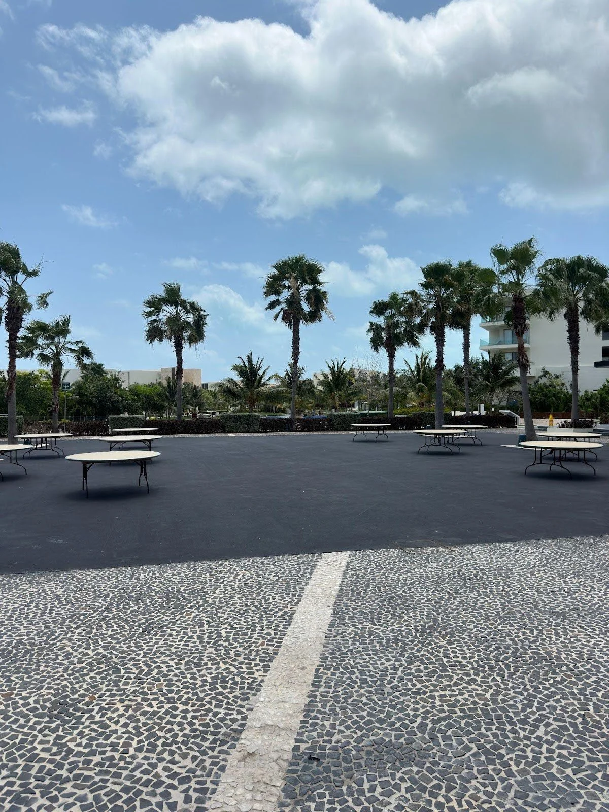 For our ceremony, we chose the Convention Center Plaza. We love this location, as it is surrounded by palm trees and provides a blank canvas that allows for complete customization of our reception. We saw many weddings here on the Facebook group for weddings at Grand Palladium Costa Mujeres/ TRS Coral and were happy with how this space holds guests. There is access to the restroom right in the Convention Center, which is also a plus. We were also very happy that our guests only have to find their way to one location, as the resort is large and this prevents guests from getting lost.