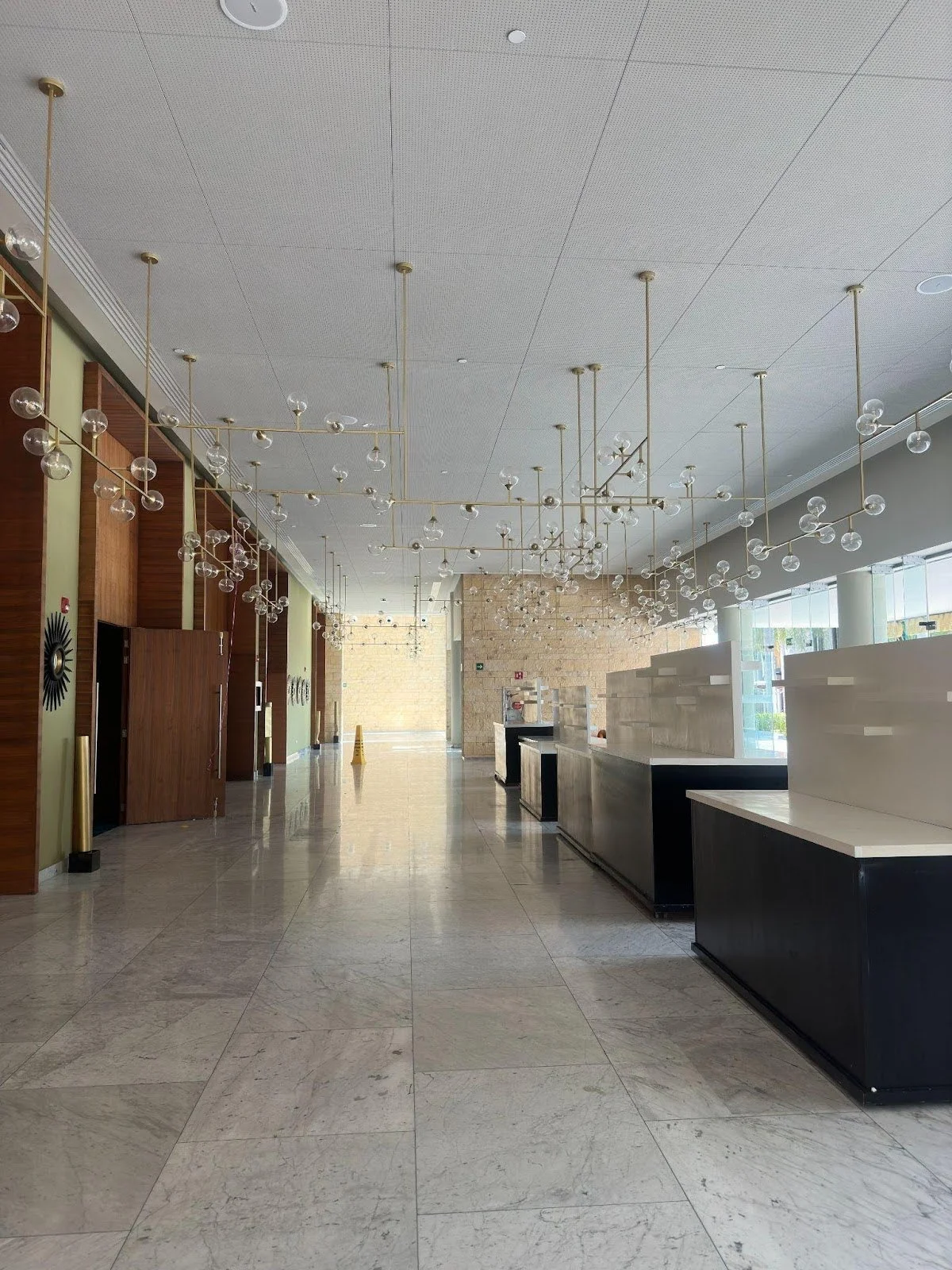 We chose the Convention Center Lobby for our cocktail hour, which we didn’t know was an option until we did our site visit. This room is also stunning, with unique bulb light fixtures scattered upon the ceiling. It also has access to glass windows and is the perfect retreat from the heat.