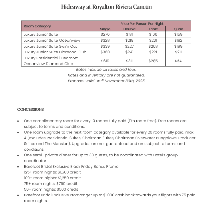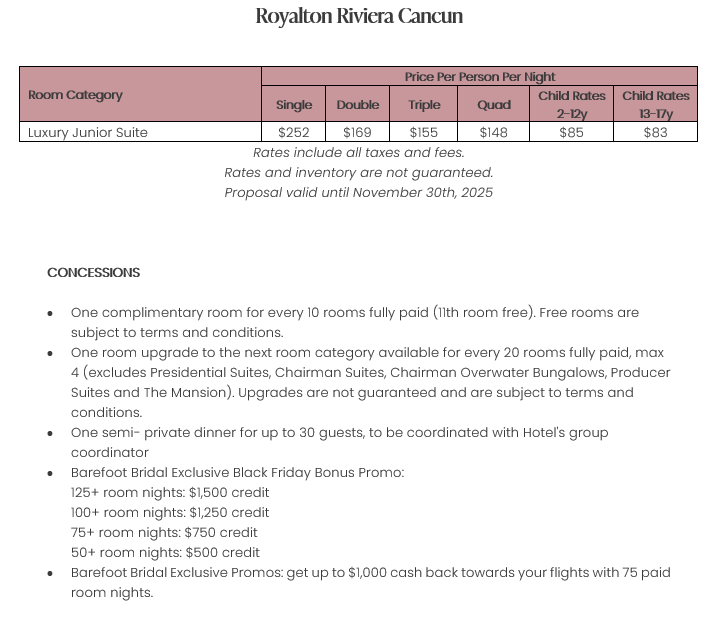 As soon as the hotels get us the rates, I’ll update this section for you. This way, you’ll have the rates and concessions for all the hotels in one spot and can easily compare.