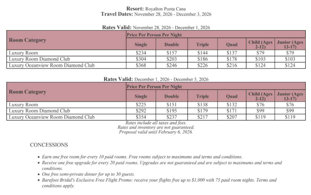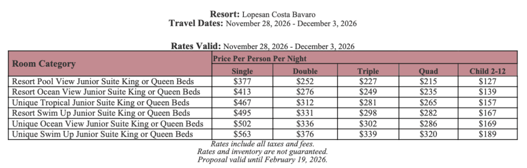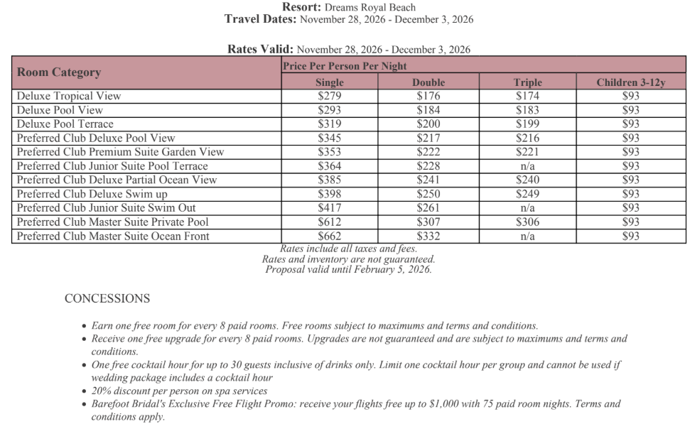As soon as the hotels get us the rates, I’ll update this section for you. This way, you’ll have the rates and concessions for all the hotels in one spot and can easily compare.