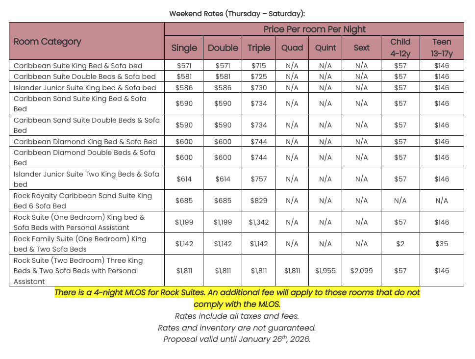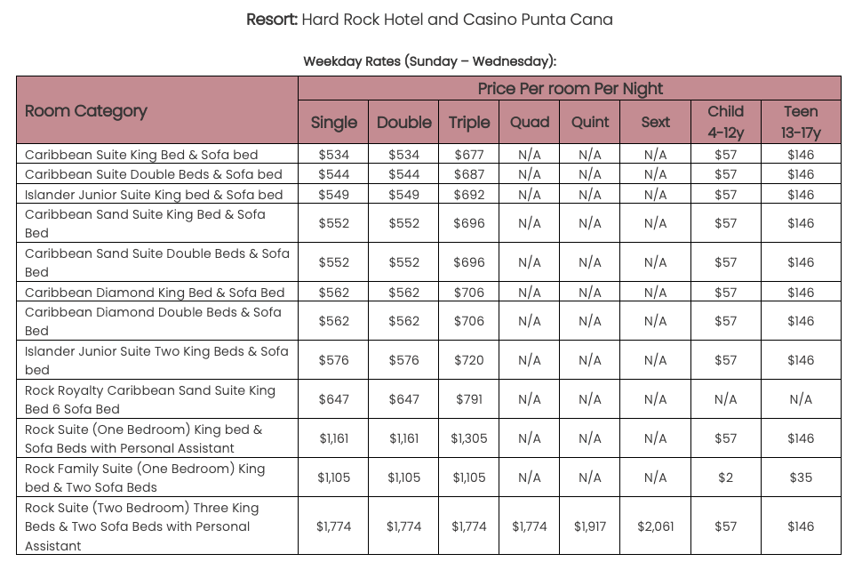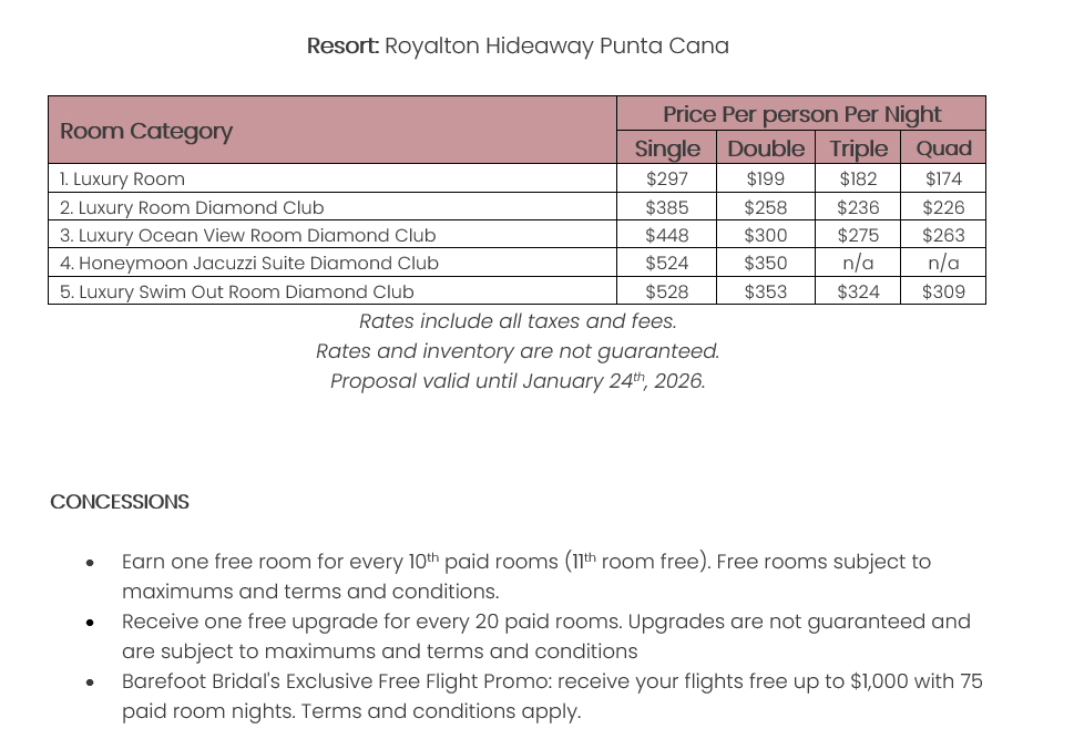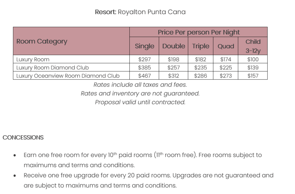 As soon as the hotels get us the rates, I’ll update this section for you. This way, you’ll have the rates and concessions for all the hotels in one spot and can easily compare.