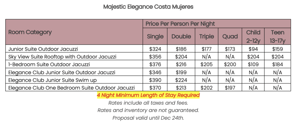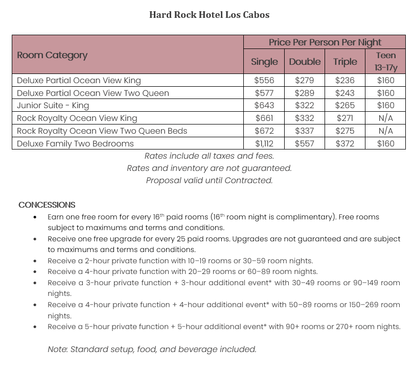As soon as the hotels get us the rates, I’ll update this section for you. This way, you’ll have the rates and concessions for all the hotels in one spot and can easily compare.