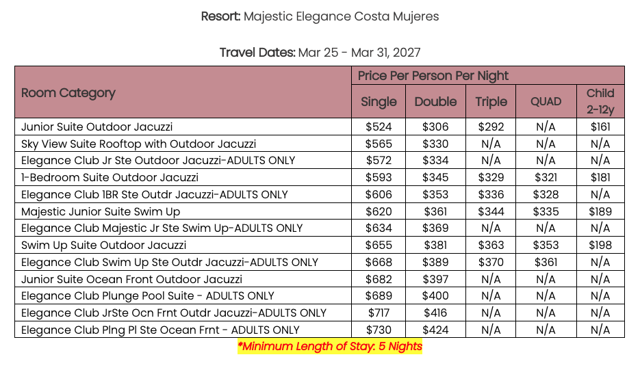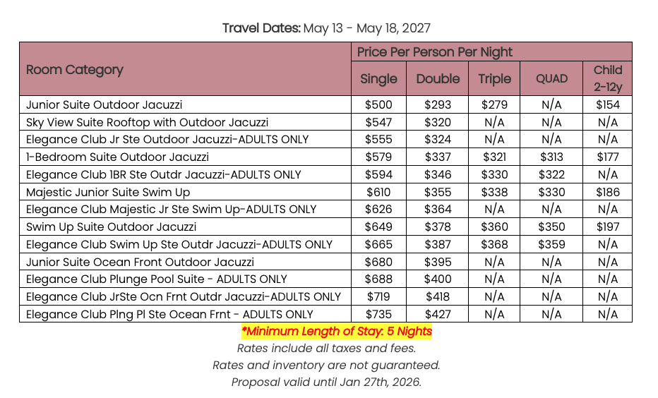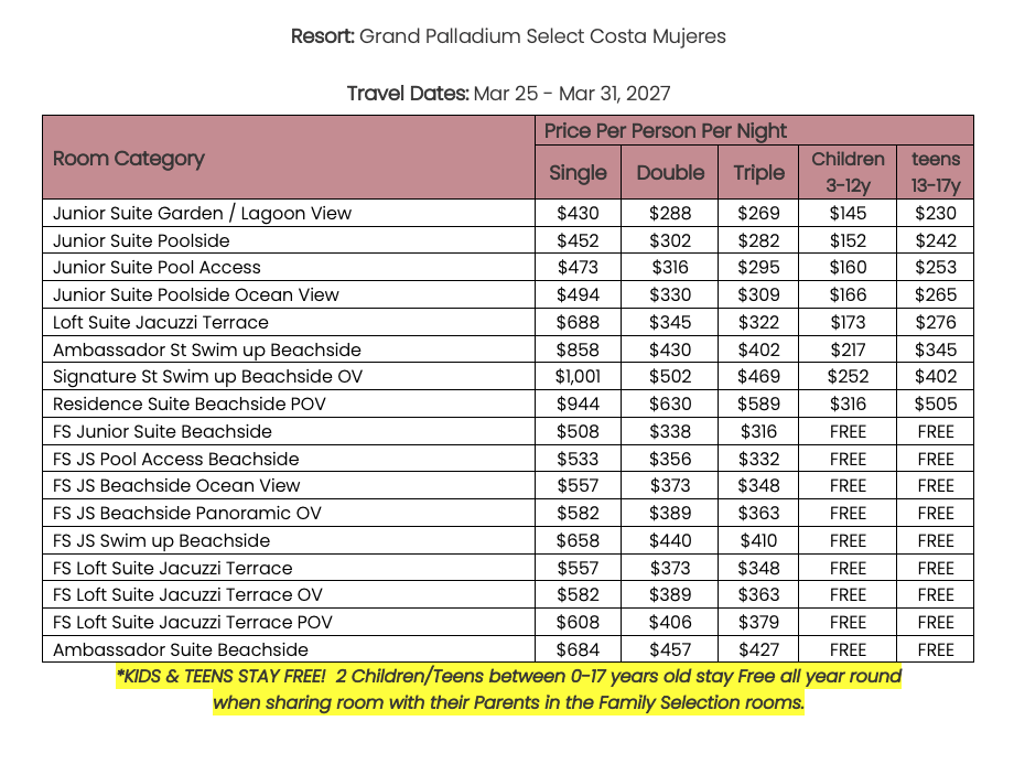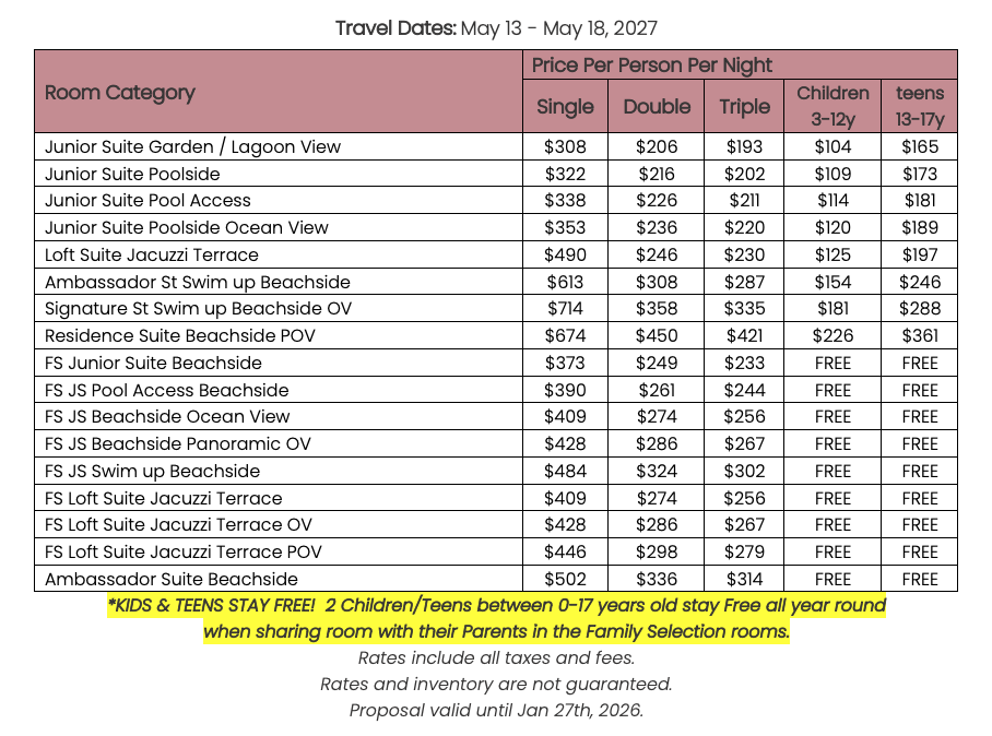 As soon as the hotels get us the rates, I’ll update this section for you. This way, you’ll have the rates and concessions for all the hotels in one spot and can easily compare.
