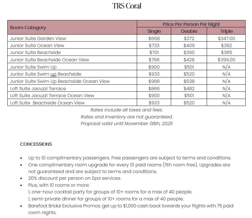As soon as the hotels get us the rates, I’ll update this section for you. This way, you’ll have the rates and concessions for all the hotels in one spot and can easily compare.