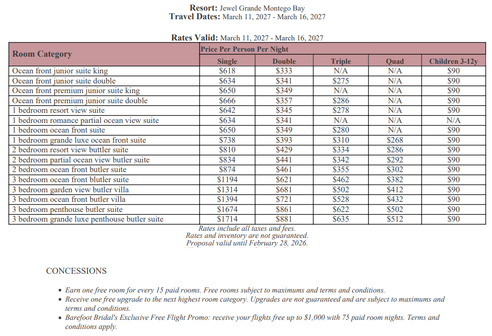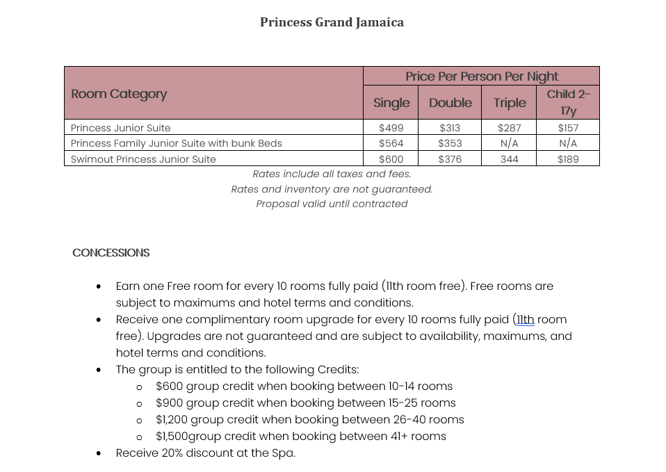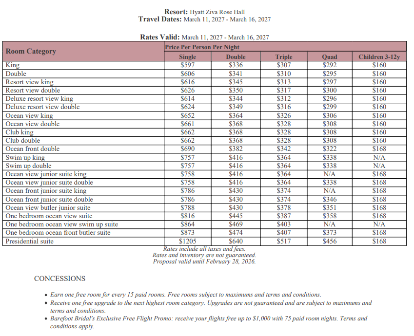 As soon as the hotels get us the rates, I’ll update this section for you. This way, you’ll have the rates and concessions for all the hotels in one spot and can easily compare.