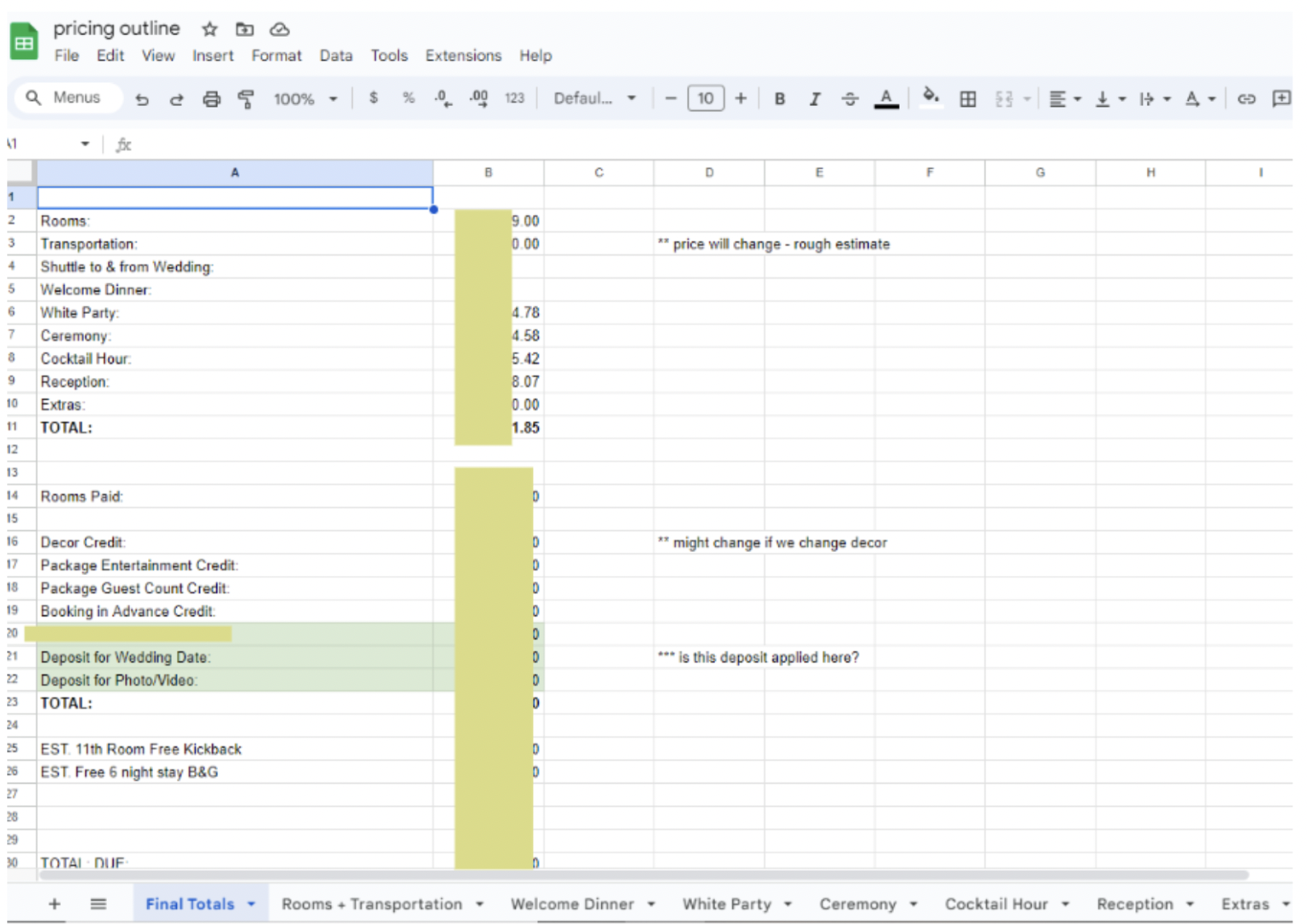 Before diving into the details, establish a clear and realistic budget. Consider all potential expenses, including travel, accommodations, venue, catering, decor, and entertainment. Do some research and join some facebook groups to get a realistic idea of the cost of weddings at your resort of choice. This will help you outline a budget.