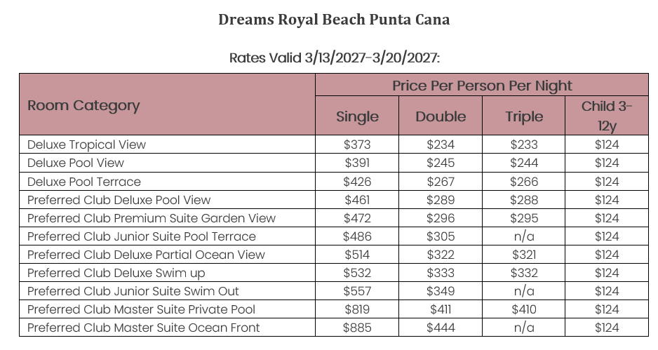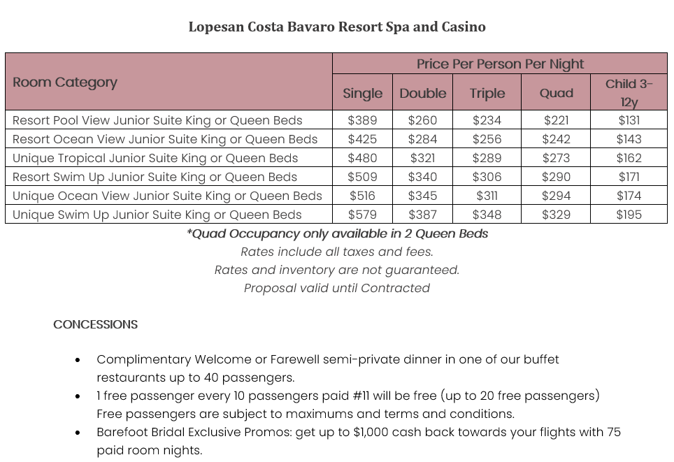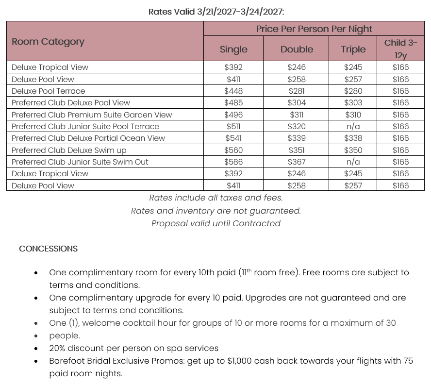 As soon as the hotels get us the rates, I’ll update this section for you. This way, you’ll have the rates and concessions for all the hotels in one spot and can easily compare.
