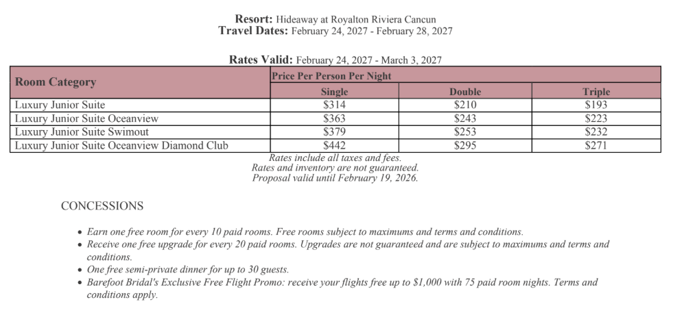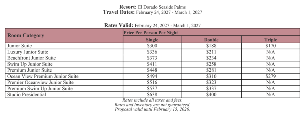 As soon as the hotels get us the rates, I’ll update this section for you. This way, you’ll have the rates and concessions for all the hotels in one spot and can easily compare.