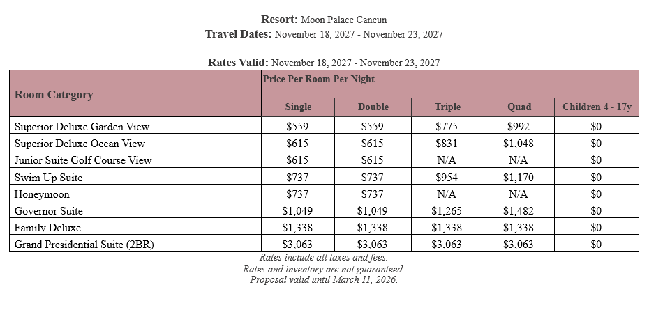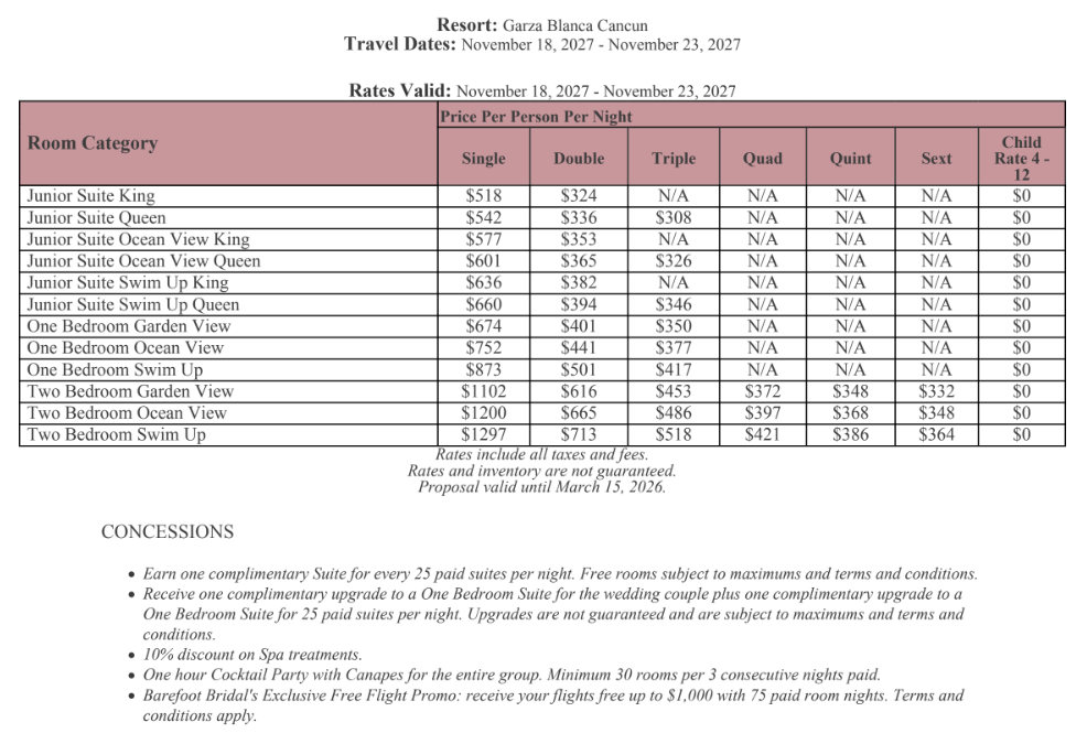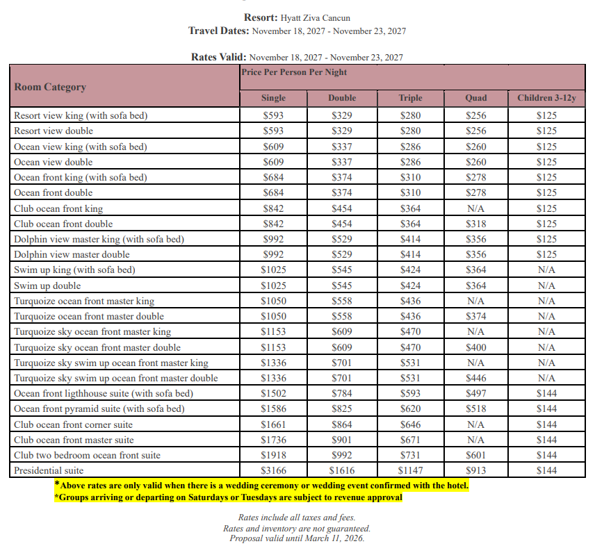 As soon as the hotels get us the rates, I’ll update this section for you. This way, you’ll have the rates and concessions for all the hotels in one spot and can easily compare.