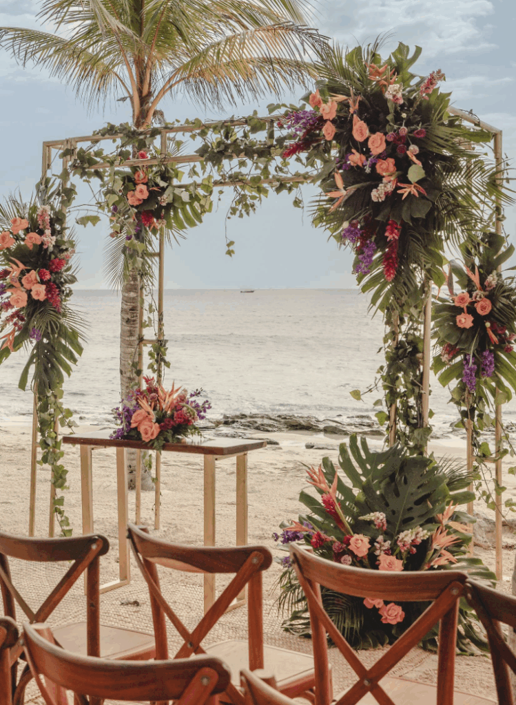 Caleta is a stunning waterfront venue surrounded by lush greens and crystal clear water. It feels intimate, tropical, and like a hidden paradise.