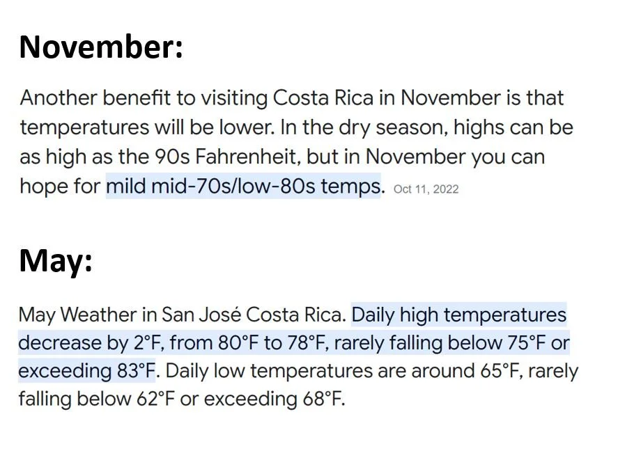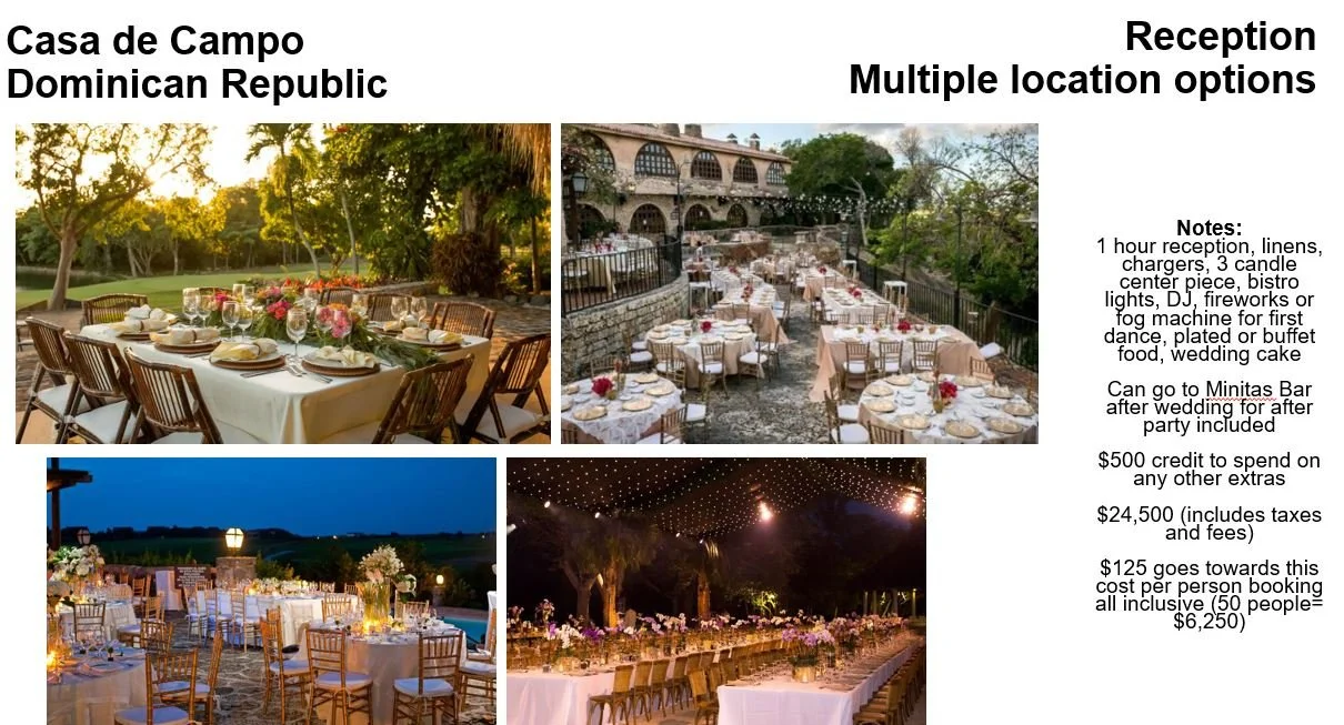 After reviewing our presentation and seeing estimated total pricing, we were able to narrow down our options to Costa Rica and Dominican Republic. We knew we wanted to see both locations in person, because of course everything is going to look picture perfect online, and used this as a way to work with two different travel agents.