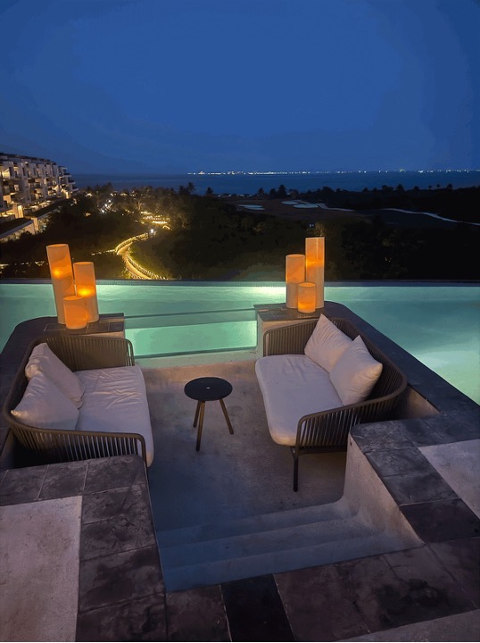 Gorgeous views overlooking the ocean and golf course, quiet loungers, elevated drink service, and at night? Pure magic. Perfect for a romantic moment or a quiet escape from the main pool scene.