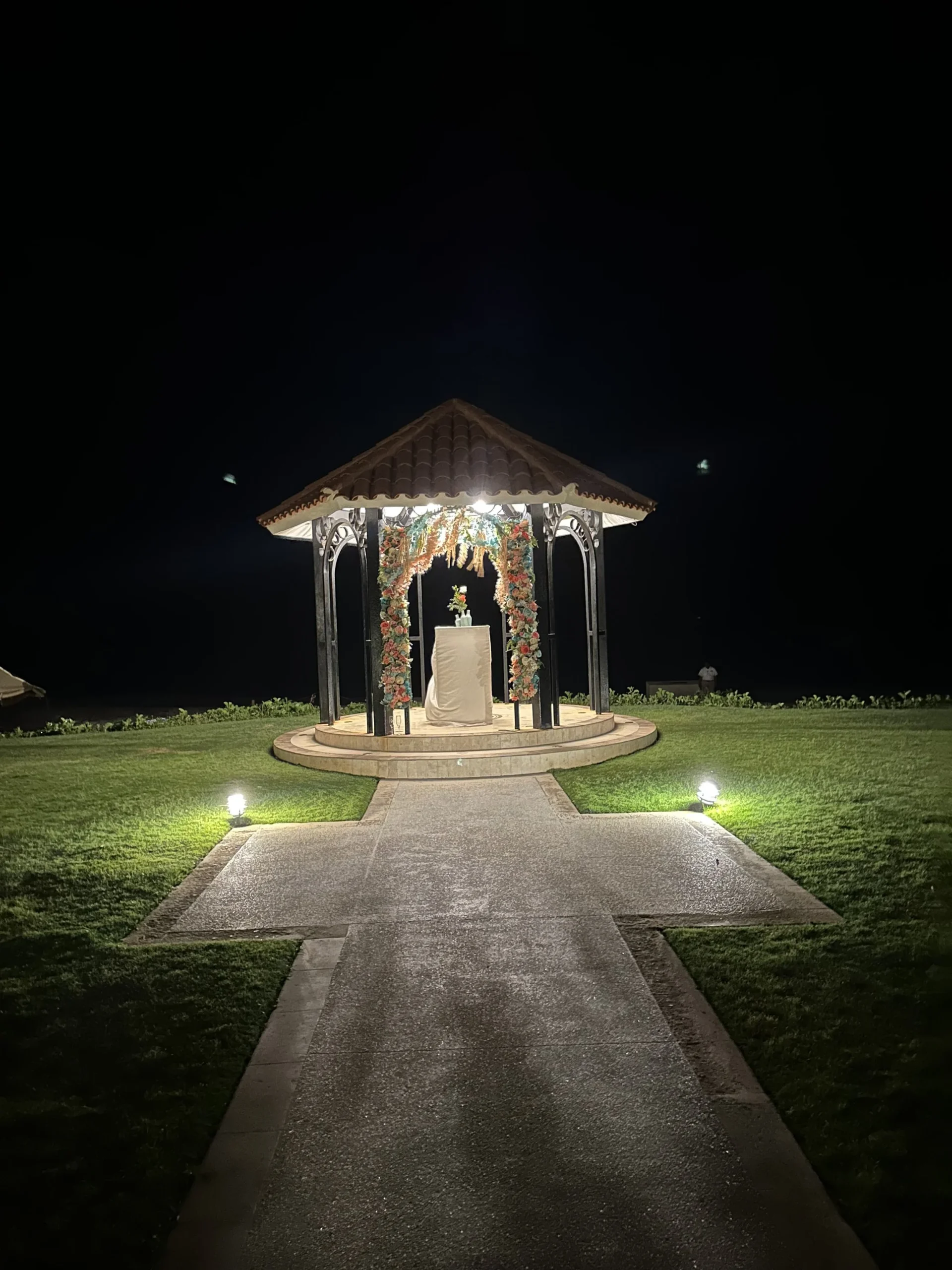In the middle of the resort is the (very, very) large infinity family pool where all the entertainment usually goes on and where the swim-up bar is located. The building where the lobby and rooms are sit a little higher than the family pool which also sits a little higher than the children’s pool. There is a water slide from the infinity pool to the children’s pool. Right in front of the children’s pool is a large area for events. Photos of the beautiful view from the lobby, our ocean view from the room, some iguanas, and the overall grounds, the infinity pool, plus an event set up, the wedding gazebo (day and night).