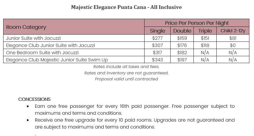 As soon as the hotels get us the rates, I’ll update this section for you. This way, you’ll have the rates and concessions for all the hotels in one spot and can easily compare.