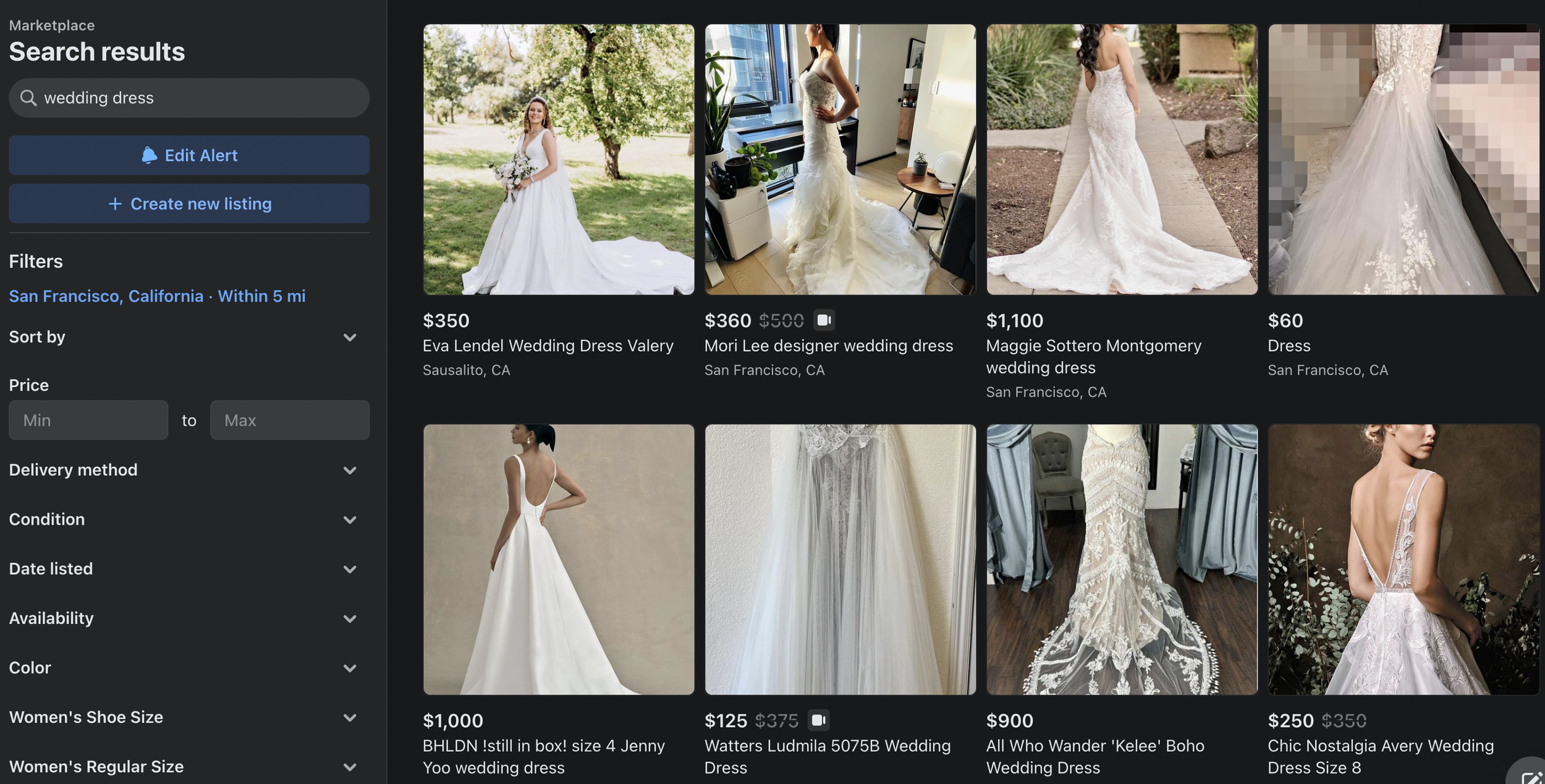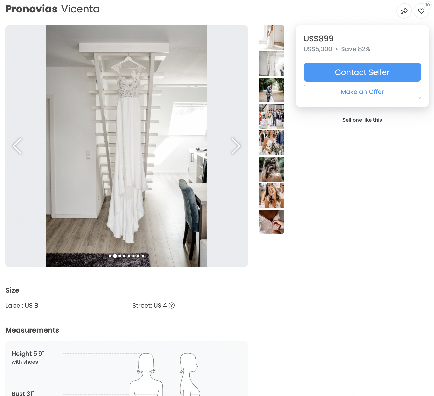 Online Marketplaces: Facebook Marketplace, Poshmark, Stillwhite, Nearly Newlywed, PreOwnedWeddingDresses.com. My life became a lot easier once I had the specific designer and model of the dresses I wanted, because my search was a lot more targeted. I had alerts set for all the different websites, and I ended up doing something real scrappy: I searched my desired dress model on Facebook Marketplace in every major city in America, found the exact dress in a reasonable size in Minnesota, got more photos of the dress from the seller (and determined that they seemed trustworthy from the conversations, receipts, and photos they provided), and had it shipped to me.
