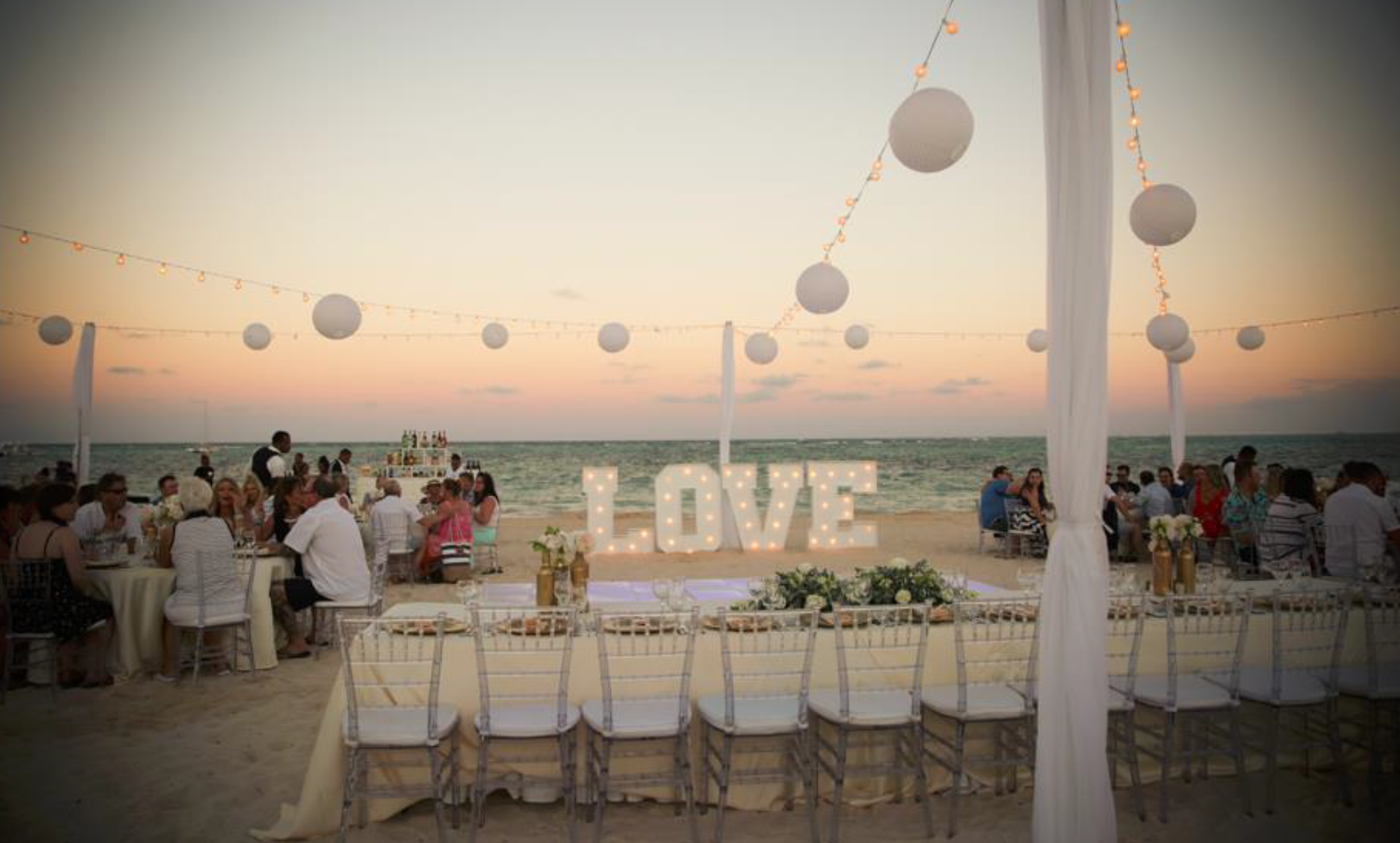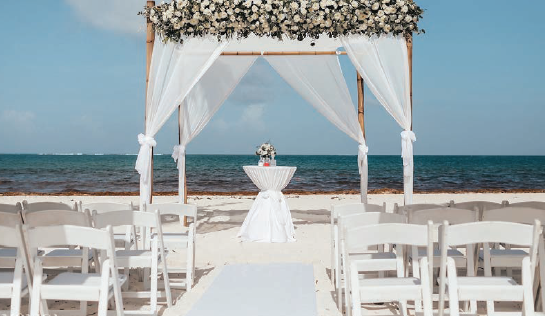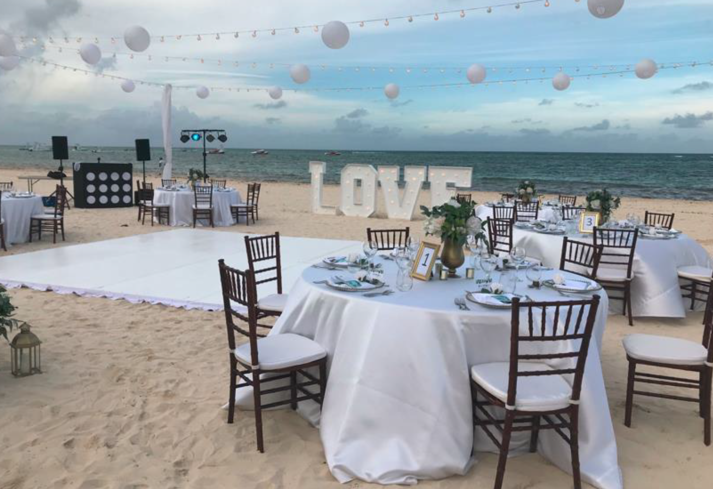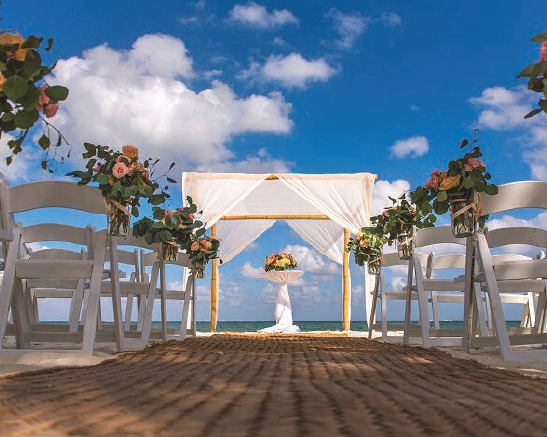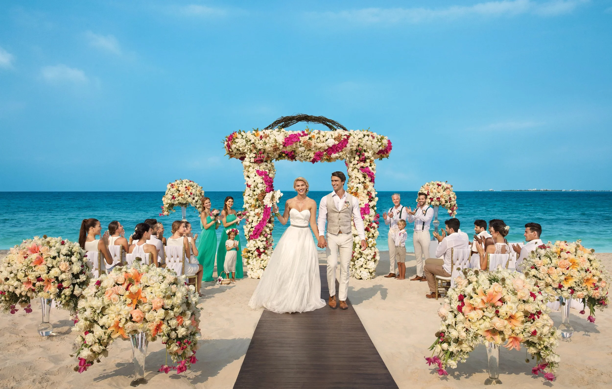 The Dreams Ultimate Package is $3,799 (or $3,599 from August through October) and includes so much! A semi-private dinner for ten, on-site wedding coordinator, complimentary room the night before, bouquet(s) and/or boutonniere(s) for the wedding couple plus 2 coursages and boutonnieres for the bridal party, a south system, hair and makeup for one, ceremony decor including 20 chairs with white covers, a wedding cake and sparkling wine for up to 30 guests, the Gold menu private cocktail hour and private dinner reception, one floral centerpiece for the sweetheart table and one for the ceremony table, live music during the cocktail hour, 50 full color photos and wedding album, and a 30 minute video of the ceremony, plus so much more.