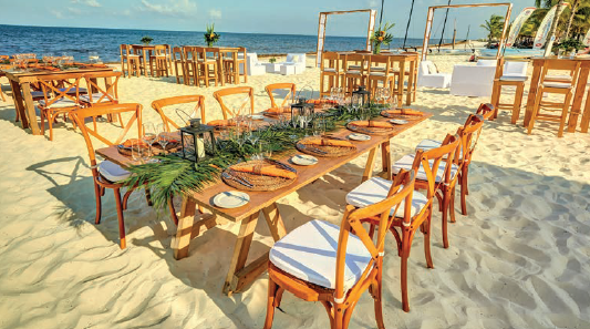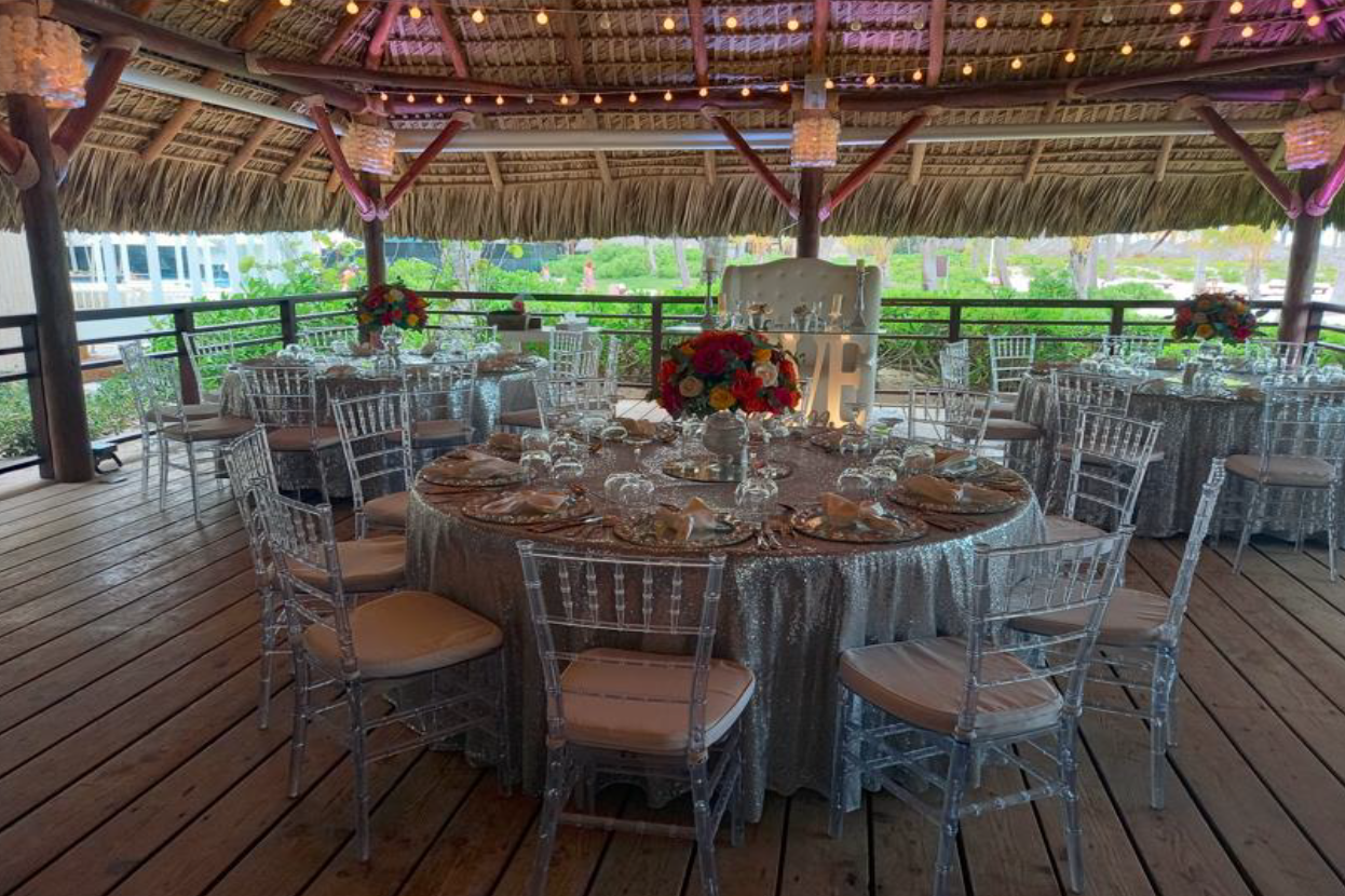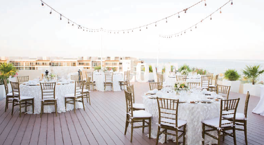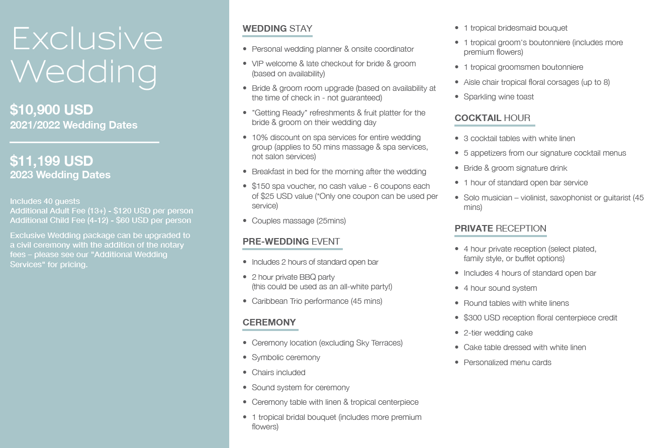 If you’re looking for more events for a larger group, the Beyond Memorable package is an excellent option. Ranging in price from $8,999 to $14,399 depending on whether you have 50 to 79 or 80 to 100 guests and time of year, this package includes (among many other things) an on-site wedding coordinator, one hour welcome cocktail party, two hour rehearsal dinner, a private symbolic ceremony, beach pergola or gazebo drapery, bouquet(s) and/or boutonniere(s) for the wedding couple, white linen covered chairs, shoe check station if the wedding is at the beach, a three-hour private wedding reception with a buffet, sweetheart table with upgraded linens, private bar with bartender, and dessert station with couple’s choice of wedding cake.