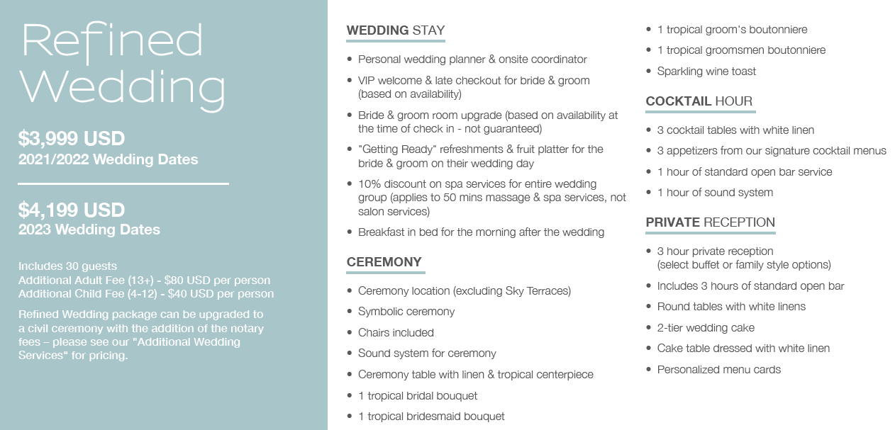 The Refined Wedding Package is $4,199 for 30 guests and includes the ceremony, cocktail hour, and a private reception. The Exclusive Wedding Package is a great splurge option. Plus, their Luxury Complimentary Pacakge for 10 guests and only $20 USD per additional guest is a great cost-effective option.