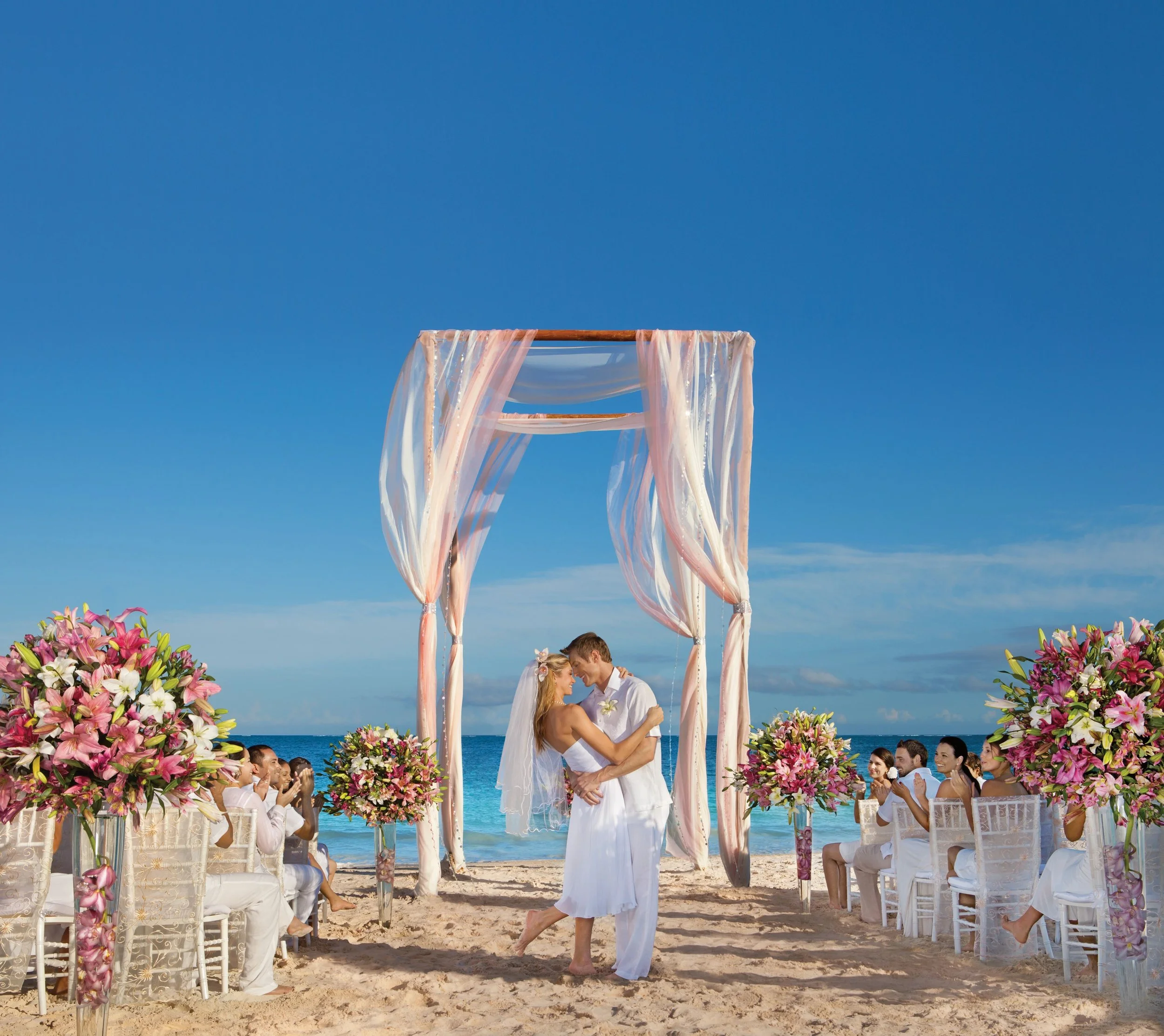 With 105 paid room nights (since most groups average 4 nights per room, that’s about 27 rooms booked or less if you and your guests stay longer), you’ll get all the following amenities: wedding planner, choice of ceremony location between beach, chapel, or gazebo, room upgrade and early check in/late check out, special bracelet with access to all resorts in Punta Cana, officiant, wedding cake, tropical table bouquet, tropical bride bouquet, tropical groom boutonniere, bag of rose petals, ironing of groom’s tux and bride’s dress, sound system and translation of ceremony if needed, marraige certificate delivered by DHL, post ceremony champagne for the group, 10% off hair and makeup for the bride, welcome selection of sweets, bridal boudouir refreshments, non-private dinner in a restaurant for up to 60 guests, romantic breakfast in suite, romantic candelit dinner for the couple, complimentary massage and use of humid area for couple, bottle of champagne twice during stay, room service, and additional services upon inquiry. Couple this with earning every 16th passenger free and we’re talking big savings!